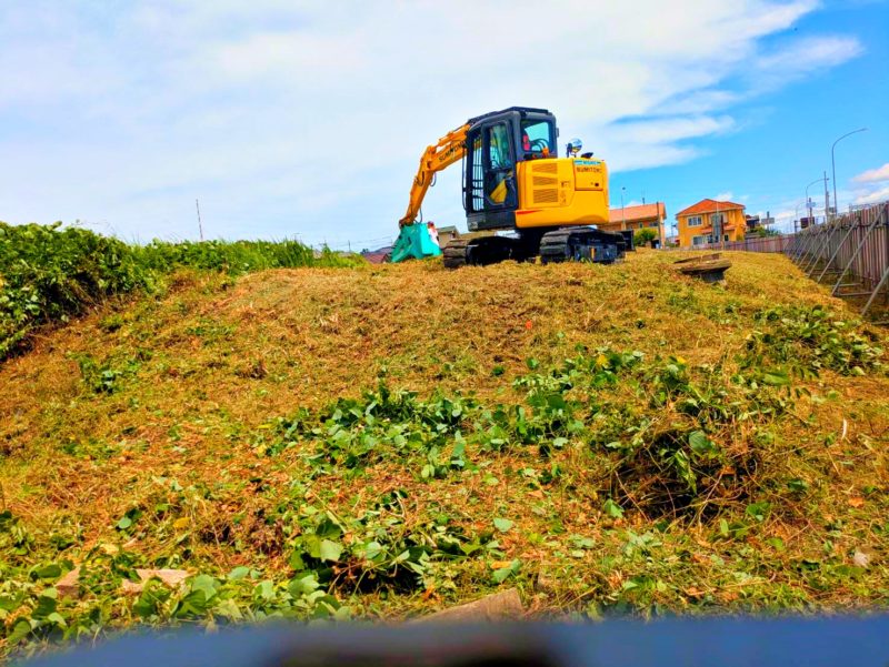 重機(ショベルカー)にも助っ人に来てもらい、邪魔な蔓をどんどん除去していきます。