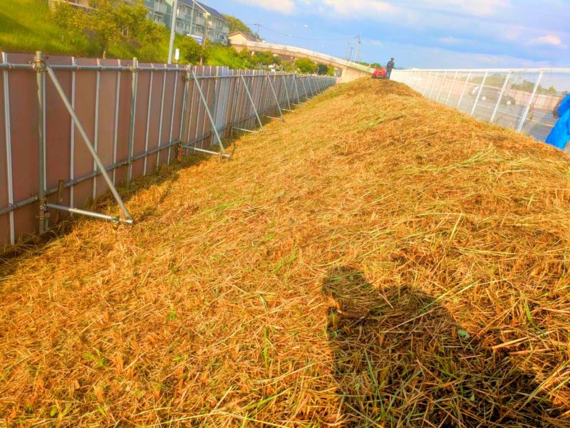 法面(斜面)の一日草刈りは暑さも加わりとても体力を消耗します。水分を多めに取りながら気合いで進めていきます。