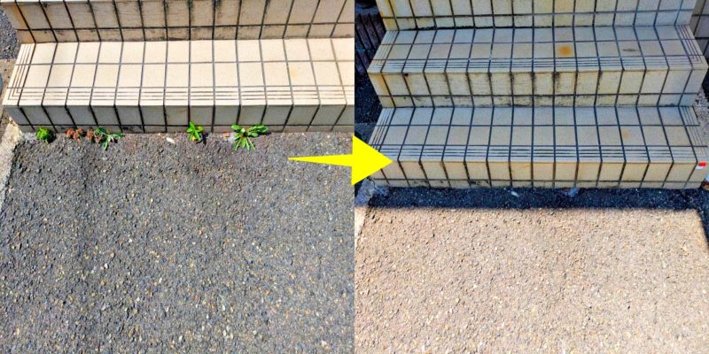 このような駐車場のコンクリとの隙間などに抜いても抜いても生えてくる雑草。懲りずに何回も生えてくるので、もはや感動するレベルです。ここの雑草もしっかり除去。