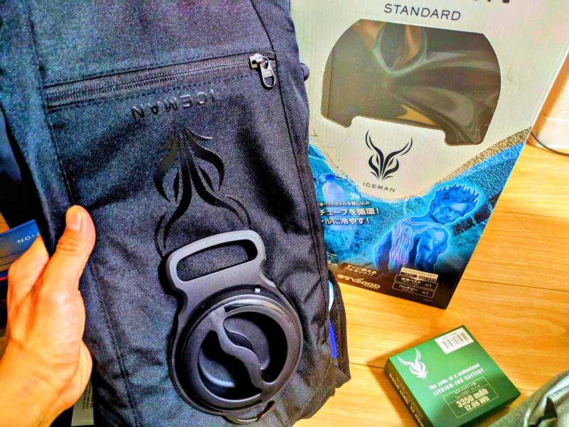 今回からこの「アイスマンベスト」という冷却服を着て作業に臨みました。でもこれ2時間くらいしか冷たさが持続しない。このリュックの真ん中が開くので、そこに冷水と凍ったペットボトルを入れます。このリュックに貼り付けてあるチューブ内を冷水が循環して冷やしてくれるというシステムです。