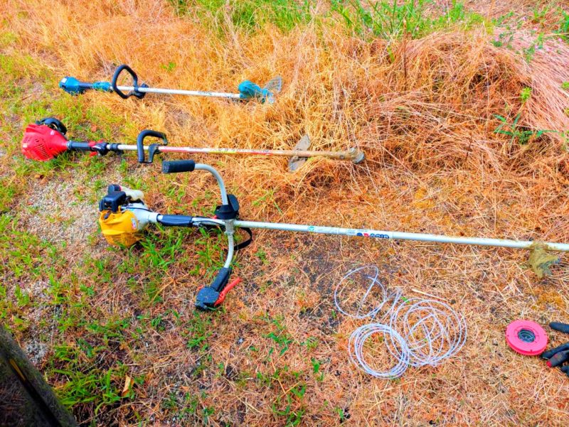 広い範囲なのと住宅地ですので、早朝は音が静かなMAKITAの電動草刈り機、柔らかい雑草はナイロンカッターで新ダイワのエンジン草刈り機、そして硬い雑草はチップソーでBIGMのハンドル式をそれぞれ使い分けながら進めていきました。