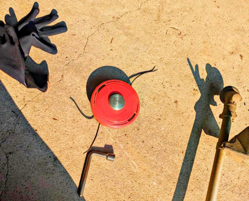 コンクリートの際や、樹木の切断幹の際、その他細かい箇所などはこのナイロンカッター(プラスチックのコード)でしっかり刈り込みました。