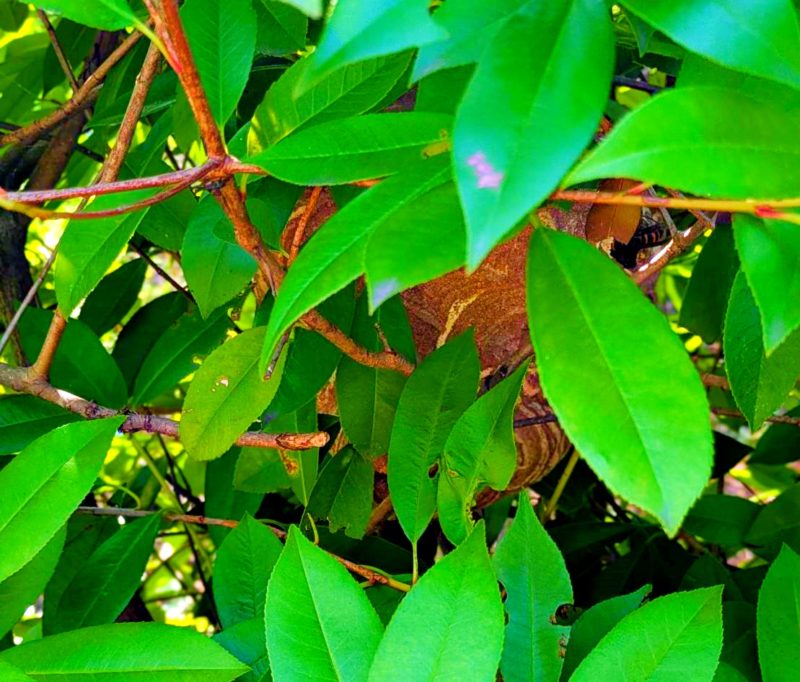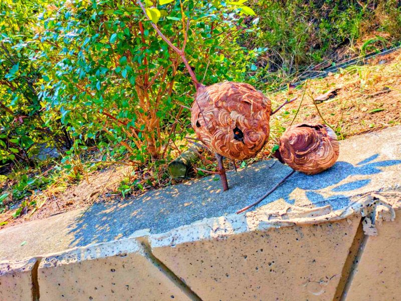 お生い茂ったエリアでの作業を進めていくと…。予感的中です。デカい蜂の巣を発見!