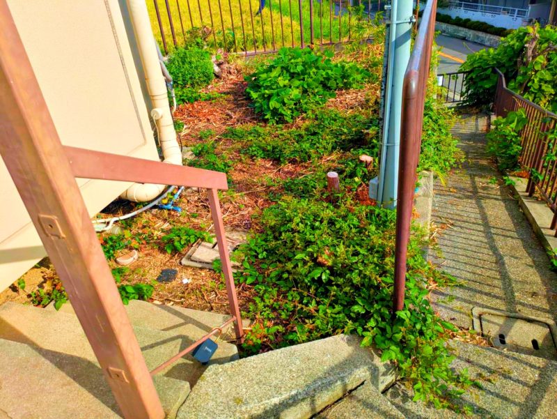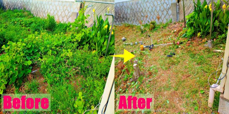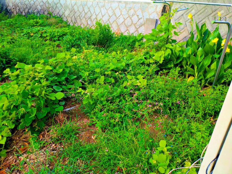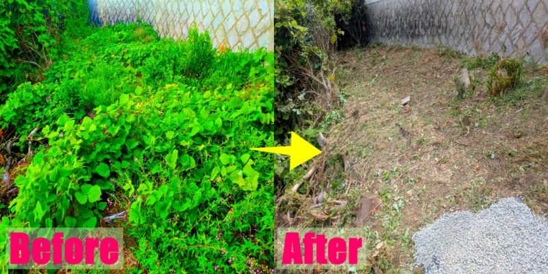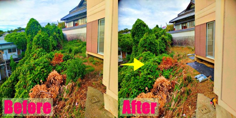 これはざっくり草刈りしたビフォーアフター。この後もう一度刈り直しをしております。