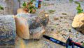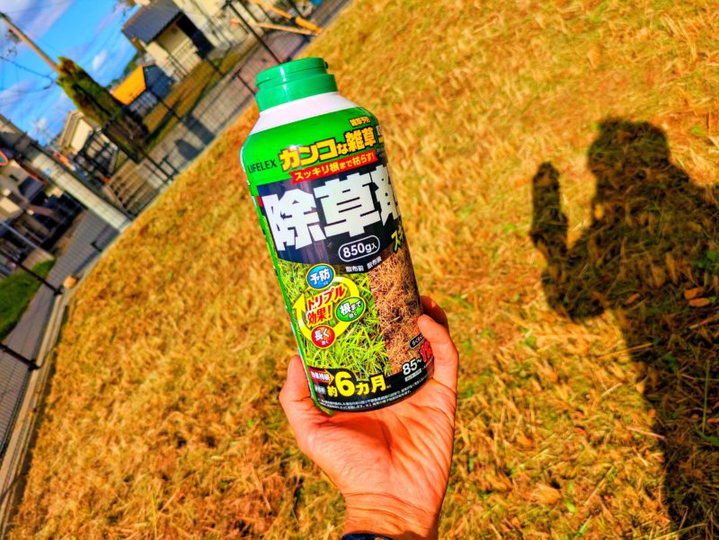 草刈りの後は除草剤(粒剤)をたっぷりと撒いていきます。防草シートを敷く前段階での除草剤散布は液剤よりこの粒剤の方が断然お勧めです!理由としては、液剤は葉から雑草を枯らしていくものなので、既に草刈りを終えた後に液剤を撒いても効果が薄いからです。