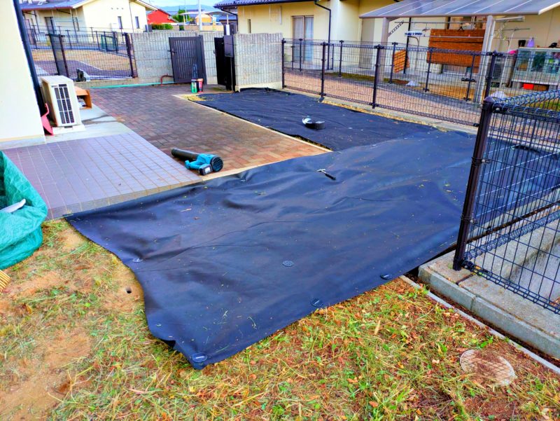 さあ部材をセットして防草シートを敷いていきます。