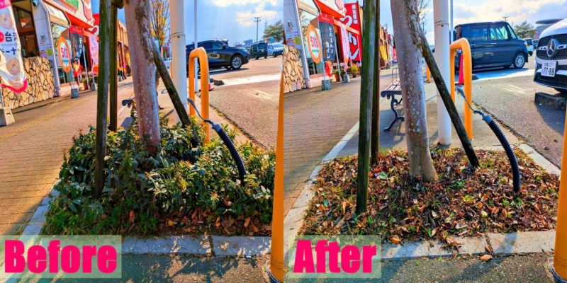 作業後の写真ですが、このような店舗前のちょろちょろっと生えている雑草もキレイに刈り取ります。