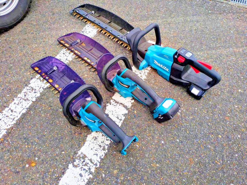 写真に写っているトリマーは全音の静かなバッテリー式です。これらとは別にパワフルなエンジンタイプのトリマーもあります。
