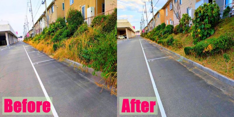 今回はイオンのお仕事で、三重県鈴鹿市にあるイオンタウン鈴鹿の除草作業(草刈りと剪定)を行いました。いつものようにグルっと外周を草刈りした後、キレイに剪定作業を行いしっかりと掃除をして仕上げていきました!