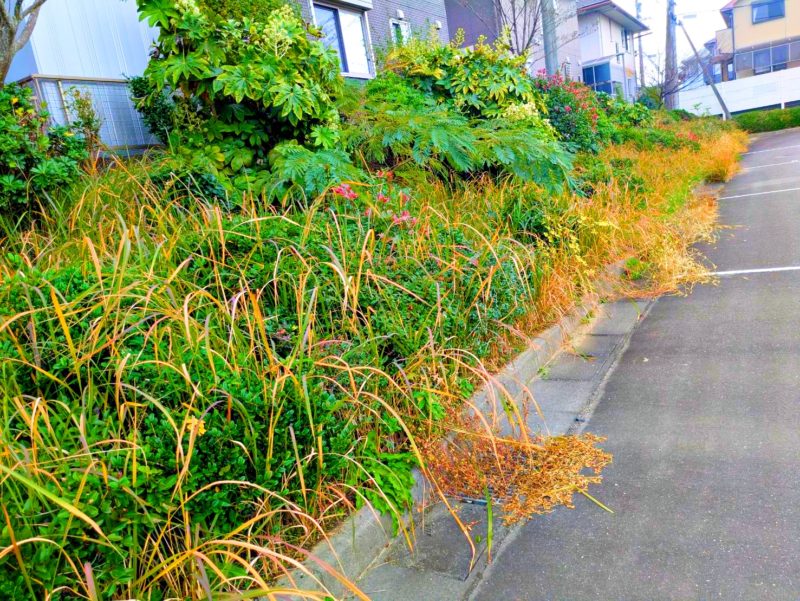 これが作業前の現場です。植栽が何処にあるのか分かりにくい状態なので剪定も大変です…。