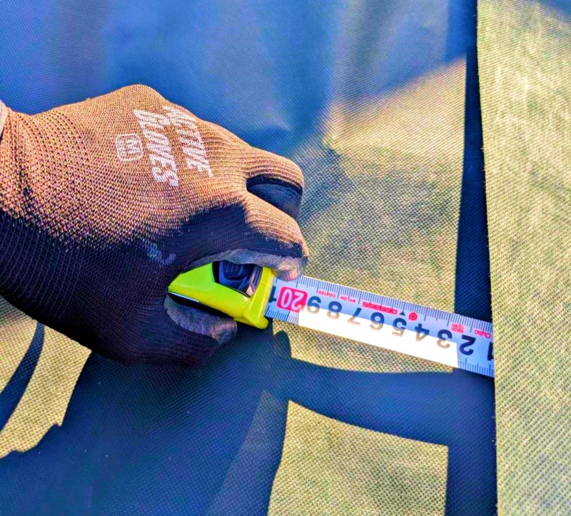防草シートを真っ直ぐに敷いているつもりでも地形の関係等でどうしてもずれていくので、150mmで細かく図りながら正確に敷いていきます。