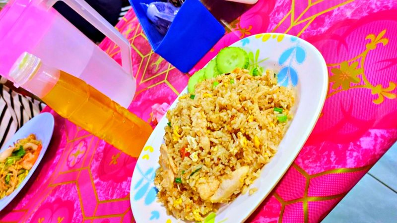 でもせっかくのバンコク旅なので夜にまた3人合流してタイの有名グルメ「カオパットクン」を食べました。確か60バーツだったので300円くらいですね。ナンプラーをたっぷり掛けて頂きました。ドリンクは100円くらいだったかな。
