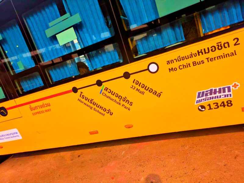 空港に着いてからはバスで移動します。しかしこのバスが難しい。よく見てらタイ語の下に英語で行先の表記がありますが、普段から日本でもバスを乗らない僕からすれば、乗り方や折り方・運賃の払い方全てに??の疑問を浮かべながらハードモードの移動でした。でもこれがまた良い旅のスパイスになっていくんです。
