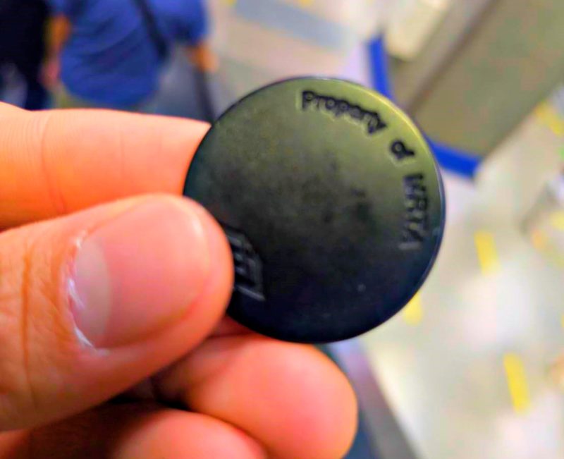 これはなに?って思いますよね?これが切符の変わりのコインです(笑)。これを改札に翳すとゲートが開きます。駅に着いて改札から出るときは切符コイン(?)を改札のコインを入れる穴に入れてゲートの外に出るというシステム。これは調べてから行かないと間違えますね。