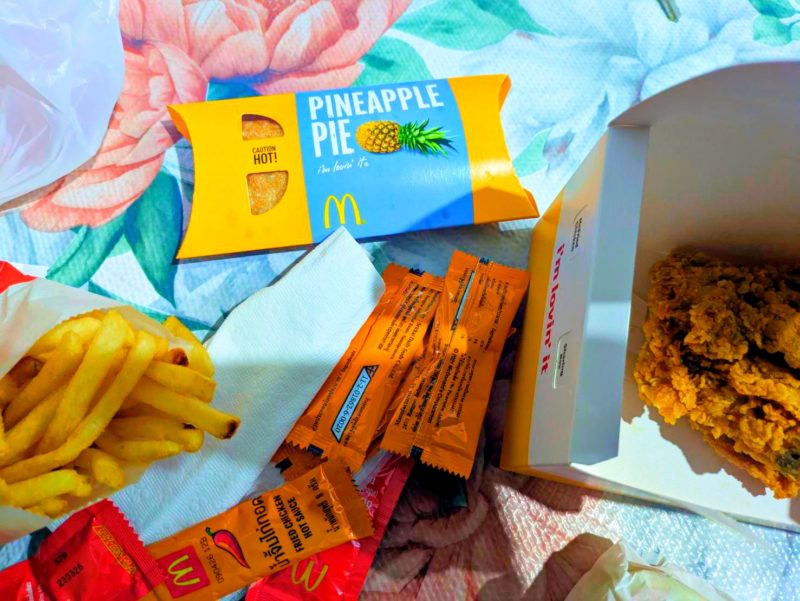 この日は食べに行く気力がなかったのと、周りのお店が19時くらいで全部閉まっていたので諦めてデリバリーでマクドナルドを頼むことに。日本にはないパイナップルパイとフライドチキンのセットを頼みましたが、ポテトについていたソースが激甘でした!アボカドの絵?が描かれていましたが「プラムソース」というものです。爽やかな甘さとありましたが、甘ったるくて全然爽やかじゃない(笑)。