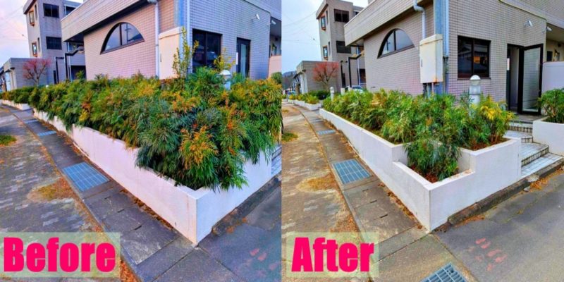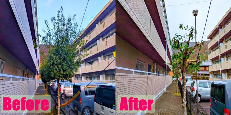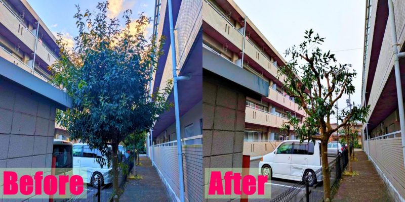 冬の時期の剪定のメリットは、強い剪定ができるのでビフォー・アフターが分かりやすいのがいいですね!気温の高い夏に強い剪定を行うと、光合成でたくさんエネルギーを使う植物がダメになってしまうことがあるので冬の方が適しています。