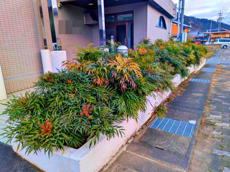 この植栽はホソバヒイラギナンテン(南天)です。かなりボリュームがありますね。ちなみにこのナンテンは毒性が含まれているのが特徴なんです。触る分には問題ないですが、摂取すると人間にも影響が出るとか。