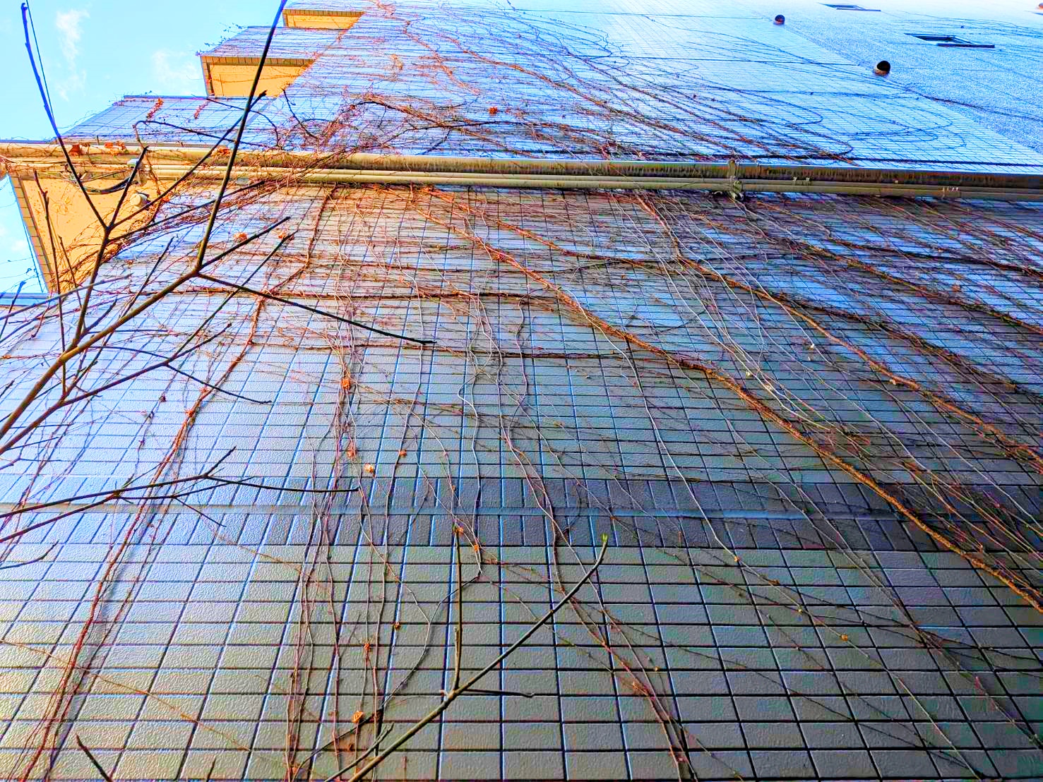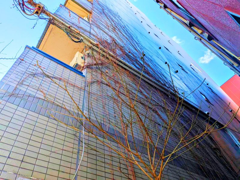 こんな感じで、ベランダから届く範囲でツタを落としながら地道に撤去していきました。安全面を考えると足場を組んでから作業する方法が一番ですが、予算的に足場を組んでの作業は厳しいとのことでこのような作業を選択しました!