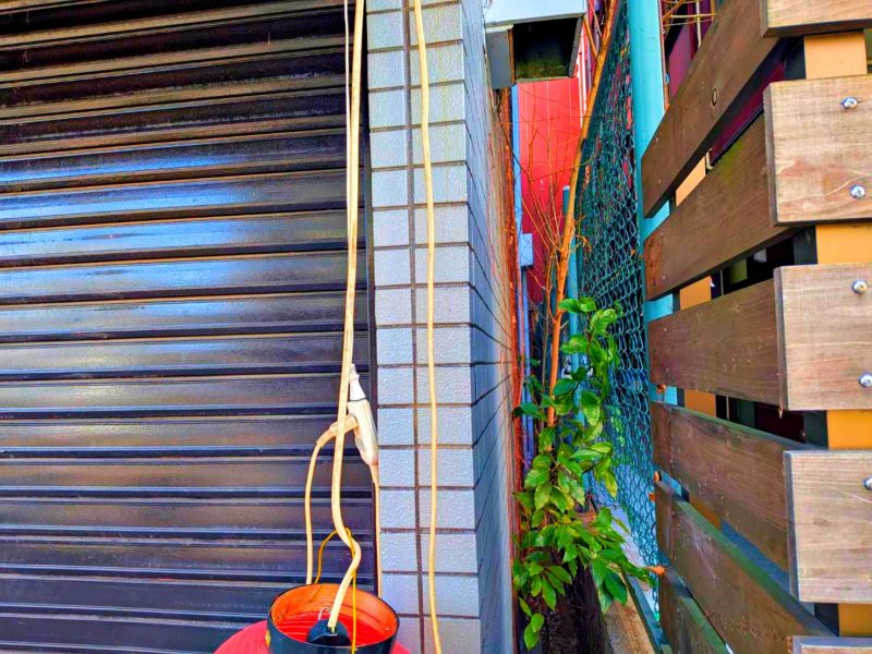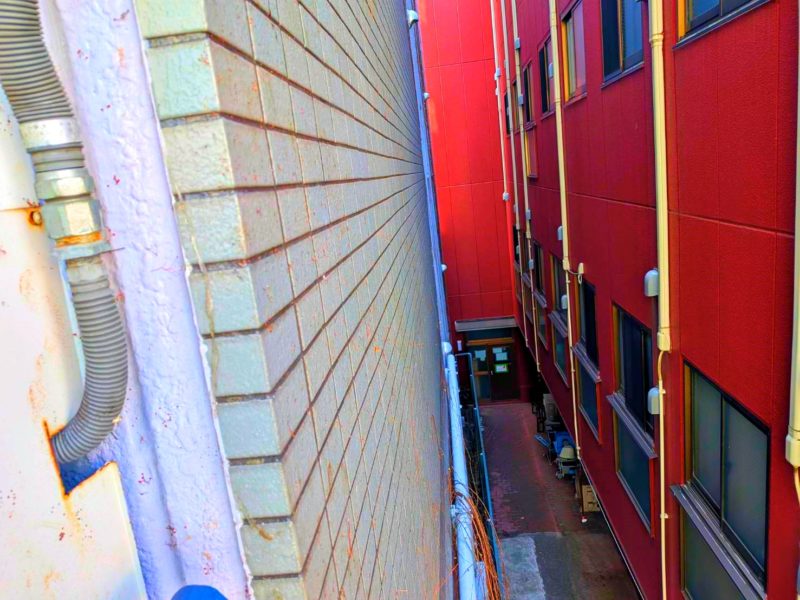 現場に到着して、作業場所を確認すると…この細い隙間を入っていかなければなりません…。ボクは細身体系なのですが、それでもギリギリ通れる幅でした。細身で良かった~。